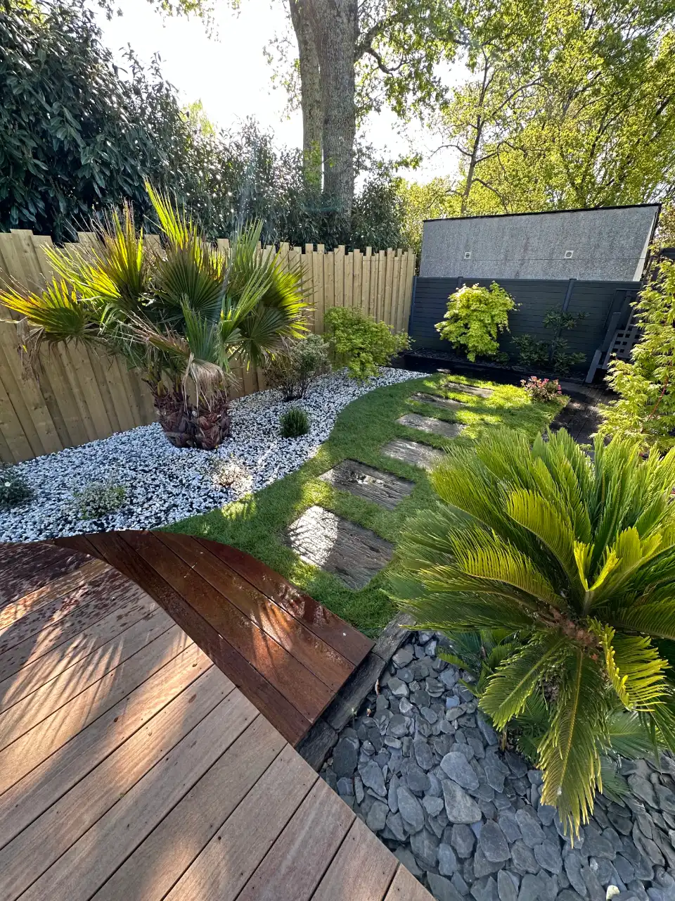 Aménagement d’un jardin avec réalisation d’une clôture, de massif, d’une terrasse en bois Cumaru et pose de gazon synthétique Vérébo